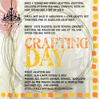Stacey at Polka Dot Daze has organised a crafty day for Auckland which sounds like a lot of fun and I've just emailed her to say I'd love to come - although why is it when I sound so definite I feel like I should throw in a small caveat along the lines of "if I can, barring any disasters or illness"? I guess it comes with being a mum. Heh. So if you're in the vicinity and it sounds good, email her and come along. It's going to be an adventure for me, driving across Auckland to totally unknown territory, and in Mat's big, grubby, work station wagon too, just to make it extra exciting. It'll totally ruin my self-image of course, I'm so used to our zippy little red Golf. I'd have never thought I'd feel a car reflected my personality, or even care too much what I drove as long as it was reliable, but somehow I've discovered I do! Geez, next thing I'll be getting some lame-o personalised plates or something (never!!!) ;)